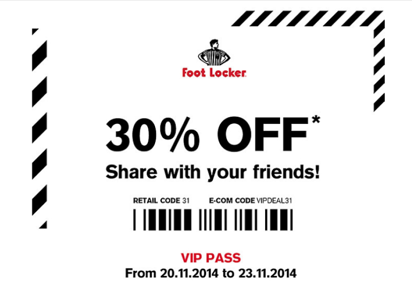 Foot Locker VIP - 20% discount! Foot Locker VIP - 20% discount! VIP voucher Your exclusive VIP pass To benefit from this special VIP promotion, simply use code VIPDEAL20 for all your orders online here at footlocker.eu. This offer is also valid in-store! Just download the voucher by clicking on the link below and show it on your phone at the register.