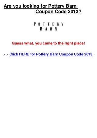 Pottery Barn promo codes and coupons | June 2022 - Promocodes.com Get 25% off orders $1000 or more + Free Shipping when you apply this coupon code at Pottery Barn. Try Promo Code. 30% Off. Apply this promo code to get 30% off orders $3000 or more + Free Shipping at Pottery Barn. Try Promo Code. Stores like Pottery Barn. Pottery Barn Coupons and Deals