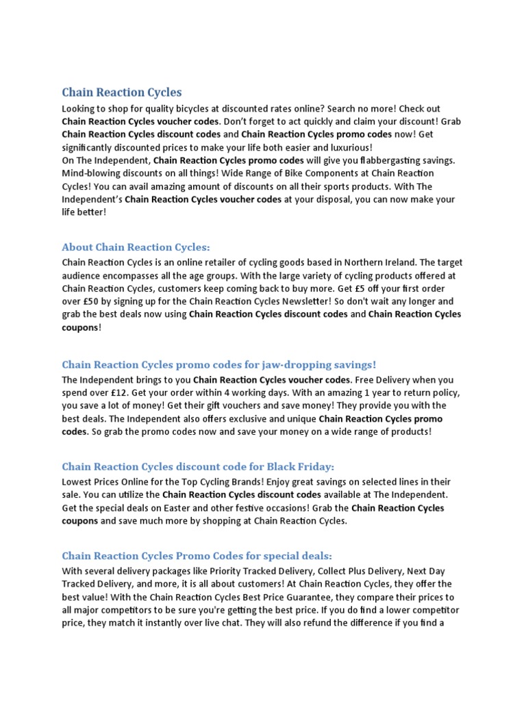 Chain Reaction Cycles Coupons & Promo Codes for September 2022 Chain Reaction Cycles Coupons & Promo Codes for September 2022 Save with these Chain Reaction Cycles discounts and coupon codes - 16 active codes 50% Off Deal Save 50% Off at Chain Reaction Cycles Up to 50% Off Sale Components Get Discount Ends Oct 20th 50% Off Amazon Up to 50% Off Sporting Goods Stores Products