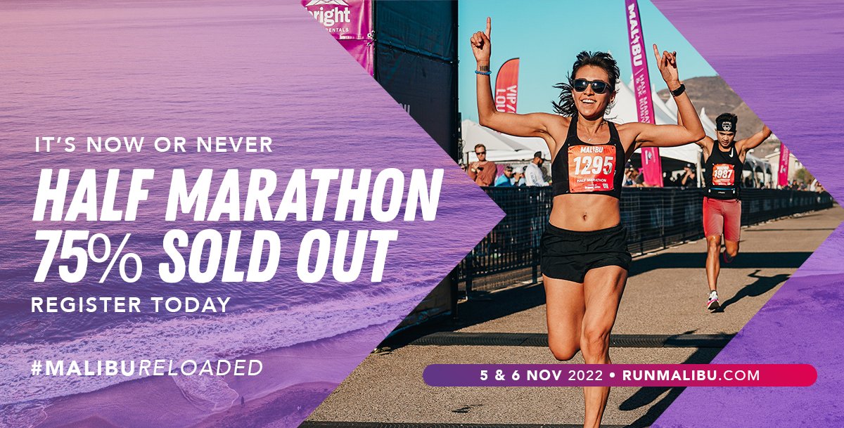 Run Malibu 11/05 6:00AM - 12:00PM PDT. Sorry! These events are full. LIMITED EDITION COMBO CHALLENGE RUN 2 RACES. GET 3. Crush our COMBO Challenge by running both our 5K and the Half Marathon. Earn THREE MEDALS after completing only TWO RACES! Start off your weekend with an energizing 5K at 8:00 AM on Saturday, November 5th, stay for the day at our Beach ...